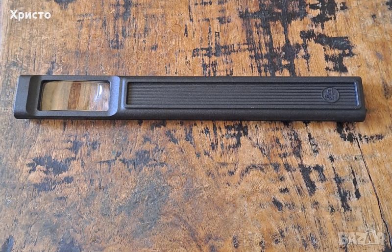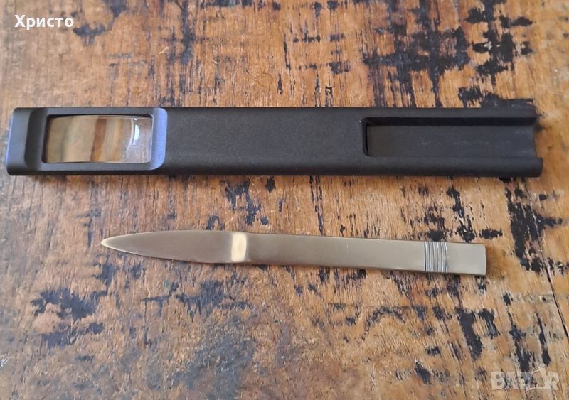 лупа с нож за отваряне на писма Henkels Хенкелс Германия Aachen Design . Произведено в Германия. Чисто нов не ползван артикул. Размер на цялото пластмасово тяло на комплекта лупа и нож е 24x3.2x1.6 cm, размер на прозрачната част визьор е 5x2.4 cm и дължина на ножът за отваряне на писма от върха до края на дръжката е 17 cm. В оригиналната кутия, която има леки зацапвания от долната страна. Размерът на кутията е 26.5x7.5x2.5 cm. Уникат, от частна колекция. Страхотен артикул. За ценители.