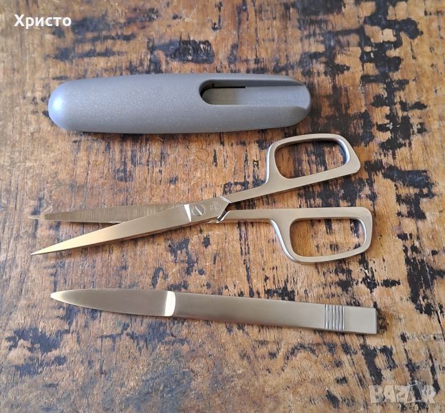 ножицата е с дължина 19 см. Комплектът е оригинален, масивен, тежък и надежден, рядък, не е използван. В оригиналната кутия, която има леки зацапвания от долната страна. Кутията е с размери 25х8.2х3.5см. Уникати, от частна колекция. За ценители.
