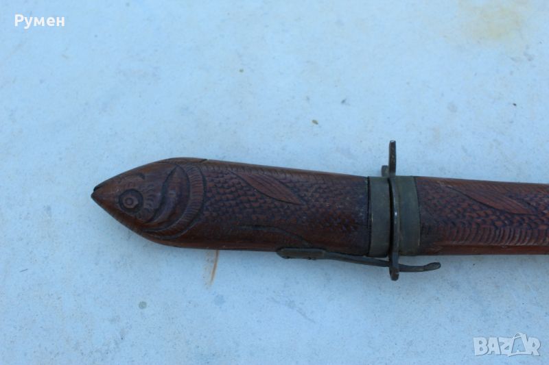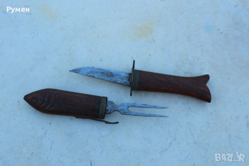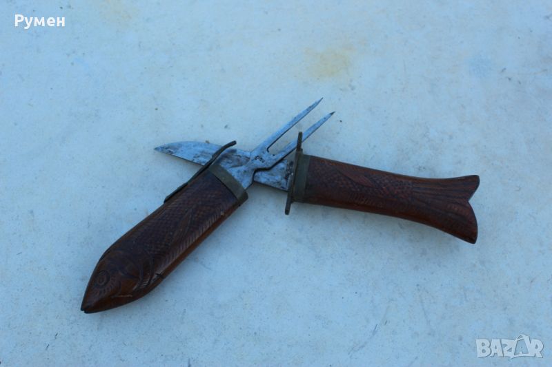 Комплект нож и вилица инкрустирани с дърворезба във вид на риба.