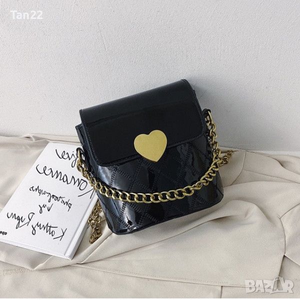 Дамска кокетна маркова лачена чанта в черно с дълга дръжка и къса с метални елементи и кокетна златиста закопчалка под формата на сърце
