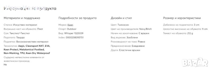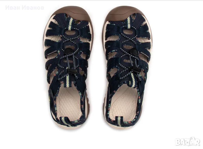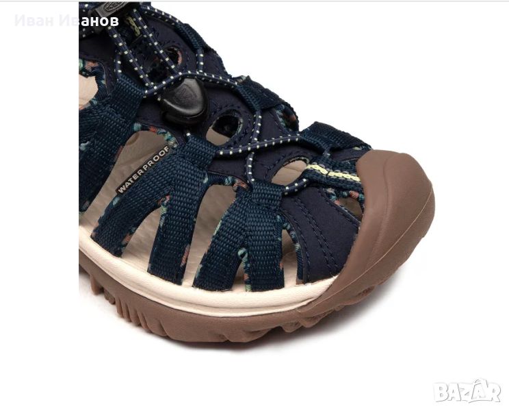 Keen Сандали Whisper 1025039 ТъмносинОт скрити заливи до буйни реки, новият Whisper може да се справи с всякакви водни условия. Бързосъхнещата и гъвкава система за закопчаване е регулируема за по-голям комфорт и безопасност на крака. Сандалът е снабден с материал ÆGIS MICROBE SHIELD®, който елиминира растежа на бактериите и намаляваща вибрациите EVA вложка, която осигурява допълнителен комфорт. Допълнително предимство на сандала Whisper е патентът "Toe Protection", който предпазва пръстите на краката при неблагоприятен терен.Технически решения:Анатомично оформена стелкаПатент "Toe Protection" - защита на пръститеБързосъхнеща и гъвкава система за закопчаванеИновативен дизайн на структурата на сандалаСандалът е снабден с материал Ægis Microbe Shield®, който предотвратява протриването и развитието на бактерииПодметка от абсорбиращ вибрациите EVA материалПодметка "Non Marking", която не маркира земятаБързосъхнещо полиестерно влакно, което може да се пере