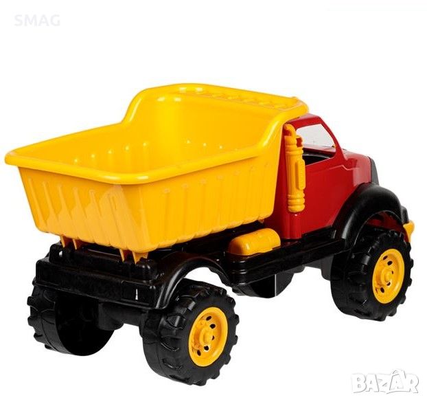 Играчка за момче, камион в жълт, червен, черен цвят с големи колела и голям пикап със самосвал.
