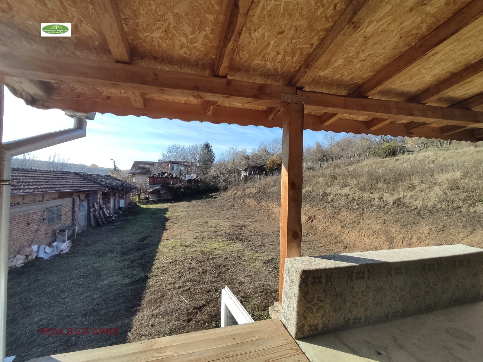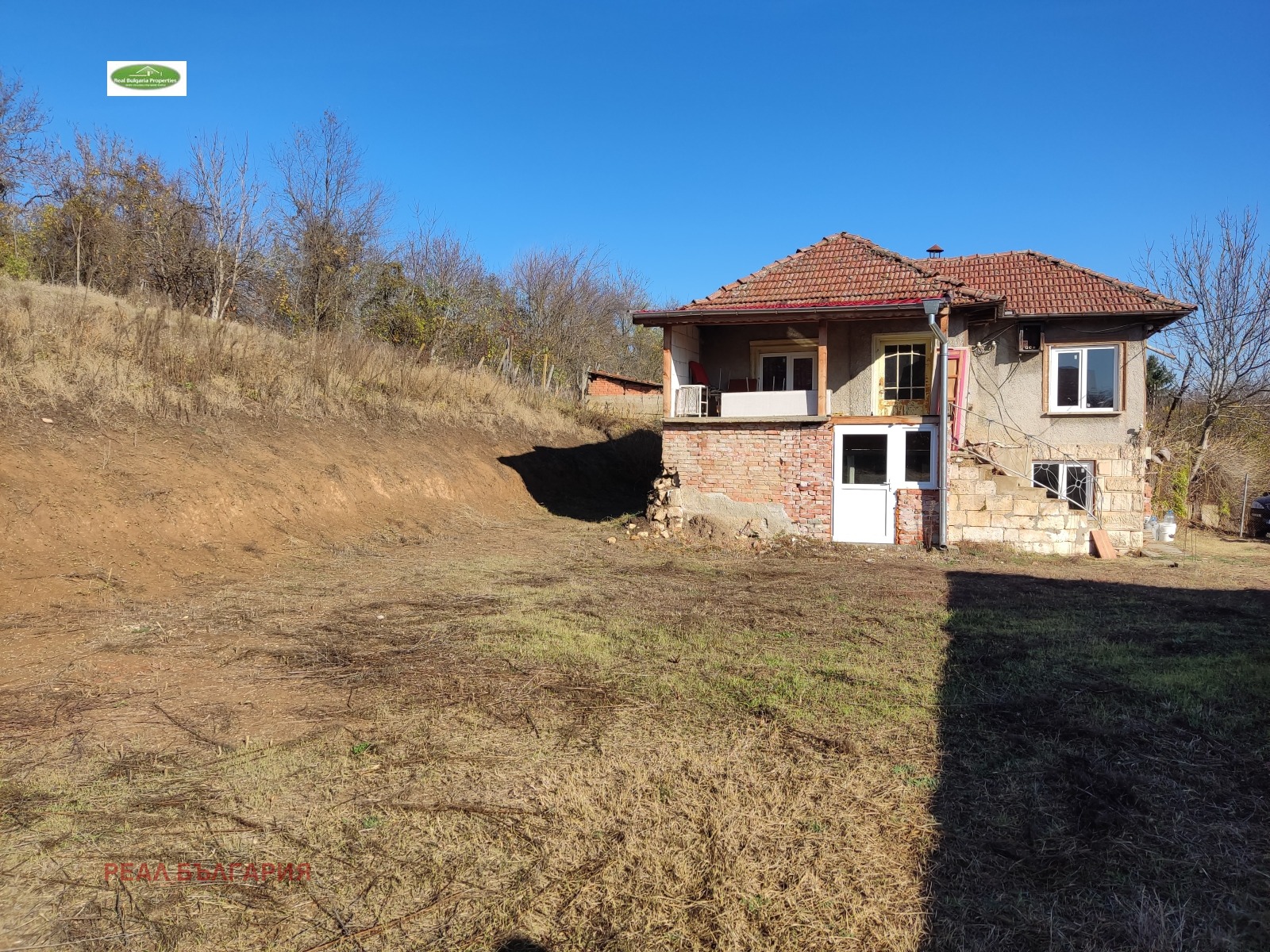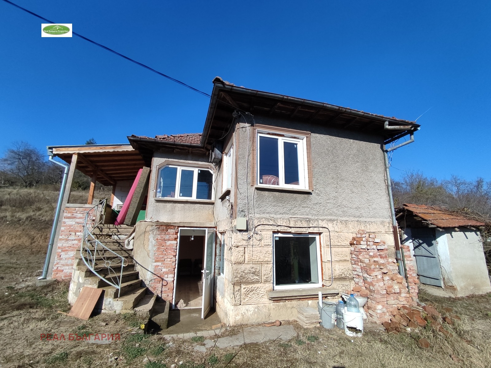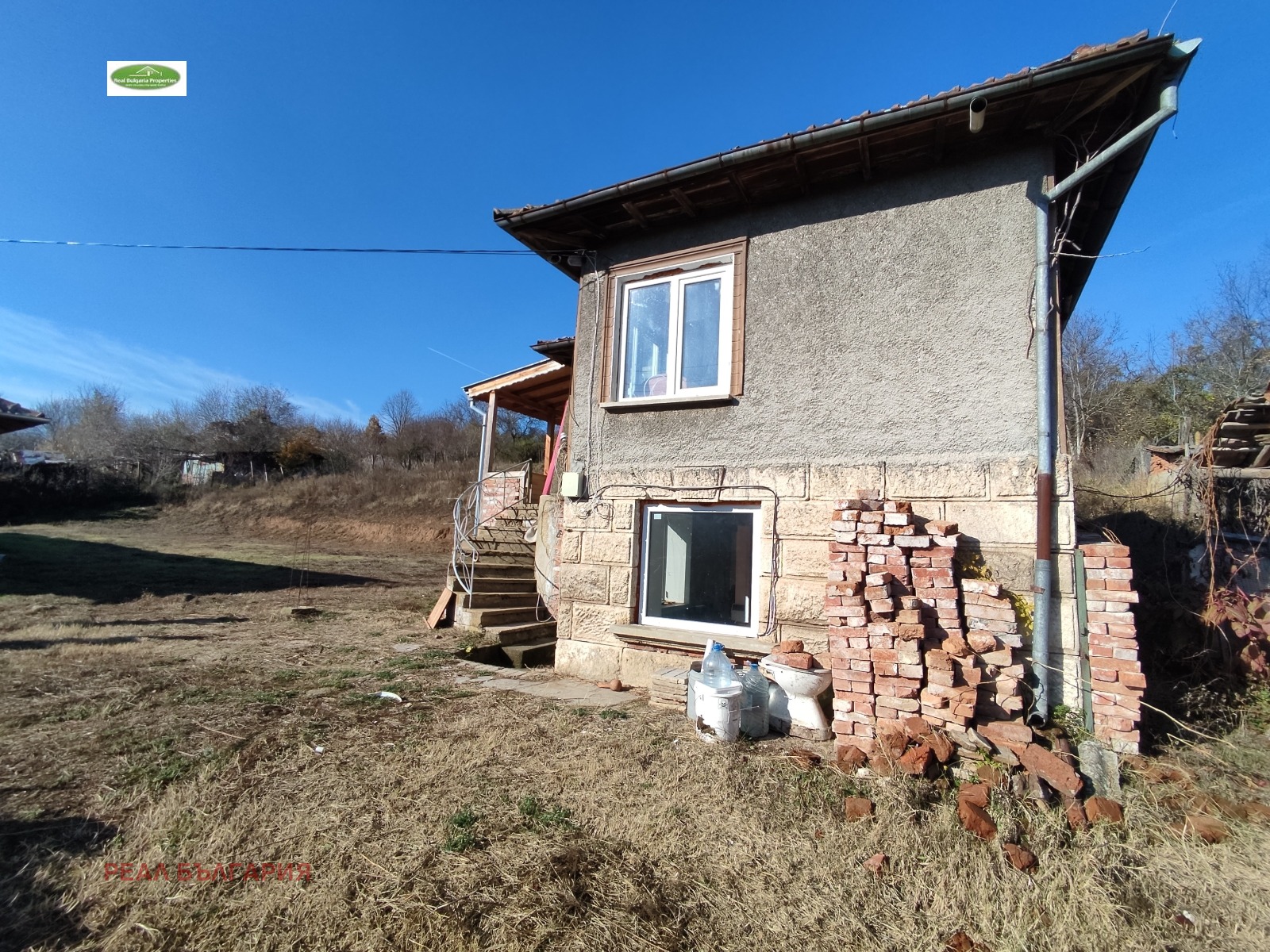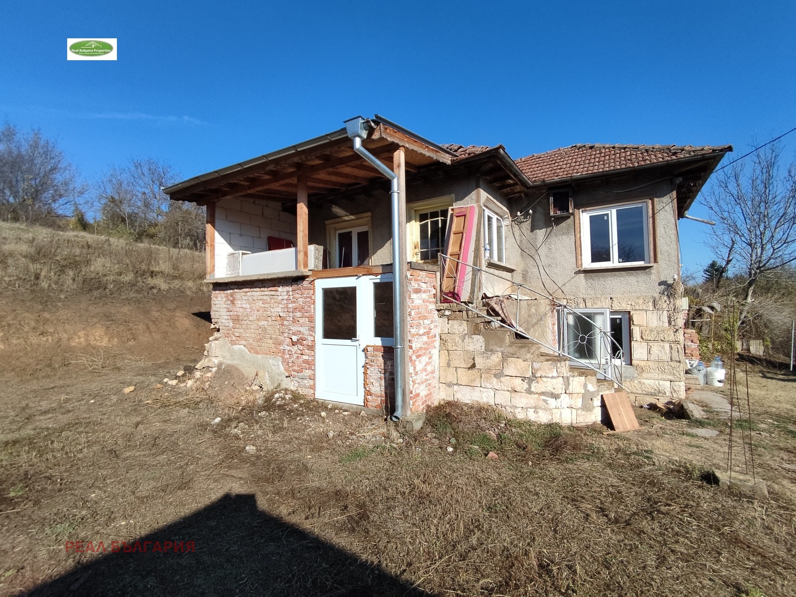 дялан камък. Приземният етаж включва: вестибюл, кухня, спалня, вътрешна баня и тоалетна и сервизно помещение. Банята е след основен ремонт, оборудвана с чисто нов бойлер и санитария. В останалите помещения стените и таваните са шпакловани и боядисани. Кухнята има нужда от довършителни дейности. Подовата настилка е ламинат и теракот. Вторият етаж е разпределен както следва: вестибюл, две спални и голямо сервизно помещение, което може да се обособи на санитарен възел. Гредоредът между двата етажа е изцяло подменен с нов. На всички прозорци е поставена висок клас PVC дограма с отлична шумо и топлоизолация. На вторият етаж е разположена красива веранда с изцяло нов масивен дървен навес откъдето се открива невероятна панорамна гледка към околността. Ревизиран покрив, без течове. Дворът е 1 550 кв.м., терасиран. Допълнително в него е разположен голям гараж за 2 коли и помощна пристройка за градински инструментариум. Гаражът е с нов покрив. Достъпът до имота е по асфалтов път. Уединеността на имота е чудесен вариант за бягство от градския шум, както за целогодишно обитаване, така и за ваканционен имот. Ние винаги сме на Ваше разположение с цел оказване на пълно съдействие при избора на финансова институция, която да кредитира Вашият бъдещ имот. Наш ангажимент е да Ви подготвим всички документи при кандидатстване за банков кредит, като услугата е напълно БЕЗПЛАТНА за Вас!