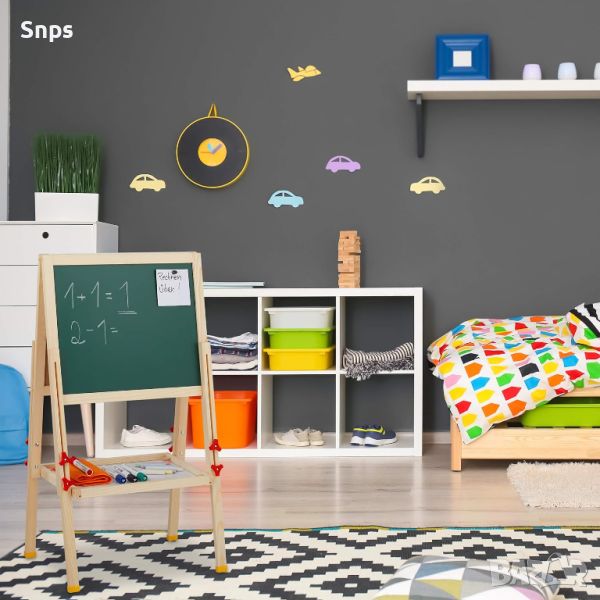 Насърчете креативността и желанието на вашето дете да учи с тази умна дървена стояща черна дъска. Регулира се на височина и следователно може да се регулира точно според размера на вашето дете. Детската дъска включва класическа дъска и бяла дъска. Повърхността е магнитна от двете страни и по този начин предлага още повече творческо пространство. Практична табла за химикалки, тебешир и гъба допълва тази страхотна дъска за рисуване. Забележка: Магнитната дъска е подходяща за деца над 3 години. Отстранете защитното фолио от двете страни преди употреба. Детска стояща дъска в детайли. Тегло: прибл. 2,6 кг. Материал: борова дървесина, метал, пластмаса. Цвят: натурален, бял, зелен. Дървена дъска с регулируема височина. Размери макс. Разширен В x Ш x Д: прибл. 104 х 45 х 42 см. Размери мин. Разширен В x Ш x Д: прибл. 81 x 45 x 33 см. Размери в сгънато състояние (В x Ш x Д): прибл. 82 х 45 х 10 см. Размери на бялата дъска и повърхността на дъската В x Ш: всяка прибл. 32 х 39 см. Вътрешни размери на рафта В x Ш x Д: прибл. 1,5 х 35,5 х 26,5 см. Стояща табла за детската стая. Бързо и лесно безстепенно регулиране на височината. 2-в-1. Бяла дъска за маркери и черна дъска за тебешир. Практичен рафт за тебешир, гъба и химикалки. Повърхността е магнитна. Може да се използва от двете страни. Извадете тавата и прегънете борда. Училищно творчество в ранна възраст от 3 години. Съдържание на кутията: 1 x стойка 14 - 14 С монтажен материал и инструкции (английски език не е гарантиран), декоративните елементи не са включени