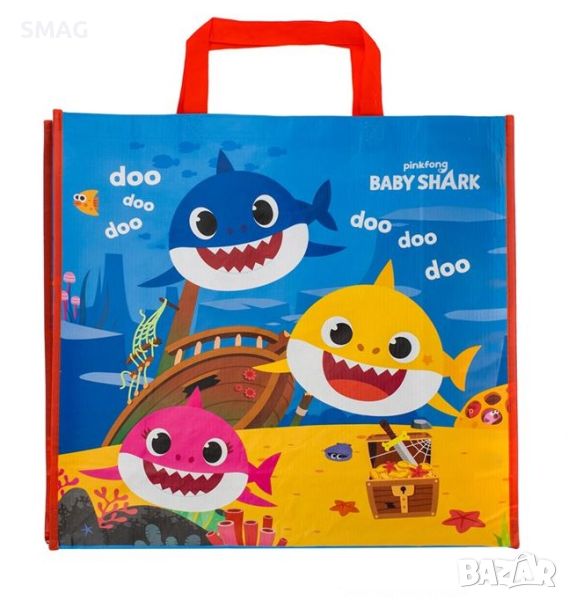 PP чанта за носене, детска цветна с дизайн Baby Shark и червени дръжки.