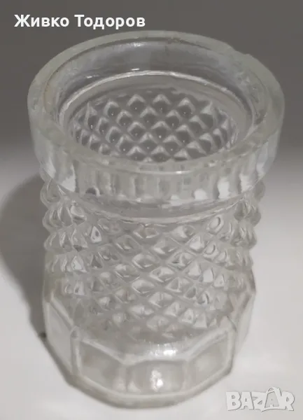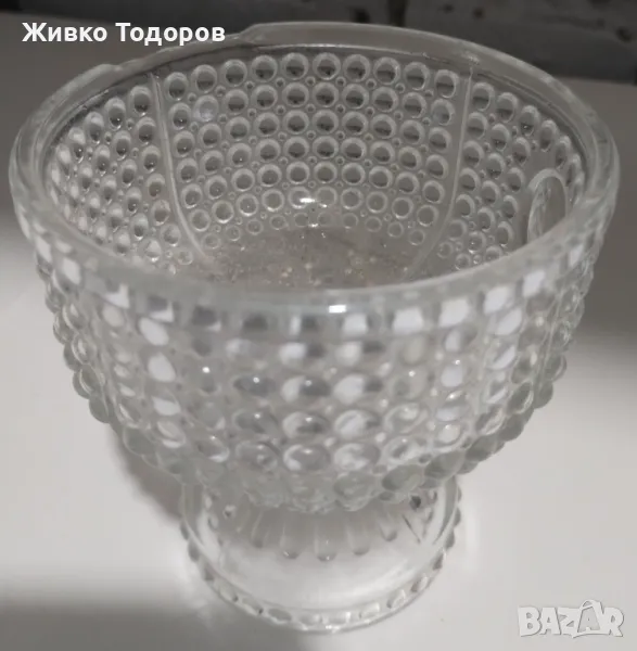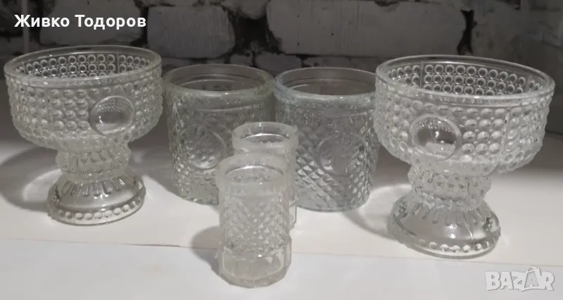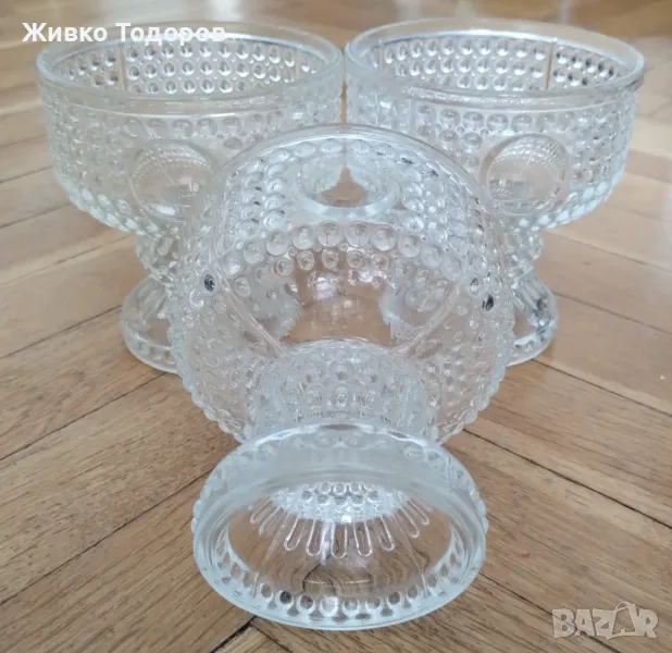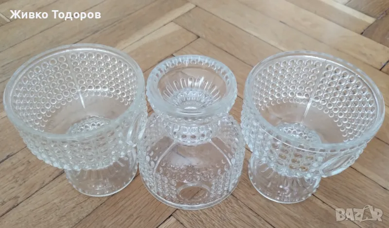 Дебелостеннен стъклен винтидж сервиз ,,Перла" проектиран от чешкия художник по стъкло Адолф МАТУРА през 1977 г. , стъкларска фабрика Либоховице,Чехословакия/Чехия - чаши за ракия/аперитив и десерт.