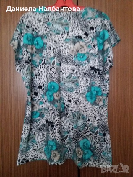 Блузка в свежи цветове. По етикет е размер L , но е уголемена и по скоро отговаря на XL. Обличана е само веднъж и е в перфектно състояние. Материята е много мека с голяма еластичност.