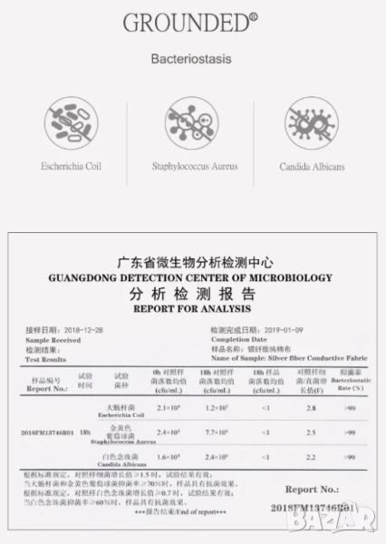 Заземяващите подложки с вплетени сребърни нишки, също така неутрализират всякакъв вид бактерии, като спират размножаването им! Като например Еширехия коли, Стафилококи, Кандида албиканс и др. (Escherichia Coli, Staphylococcus Aureus, Candida Albicans...)