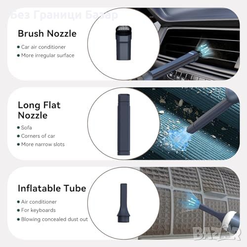 Многофункционални Приставки: Включени дълга плоска дюза, четка и надуваема тръба.