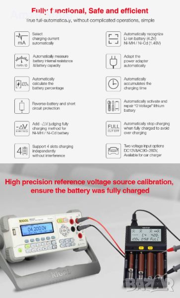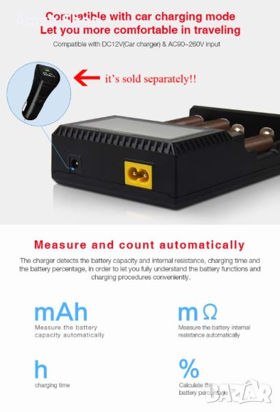 Това интелигентно зарядно устройство е съвместимо с почти всички видове акумулаторни батерии като Li-Ion, IMR, INR, ICR, Ni-MH, Ni-Cd.