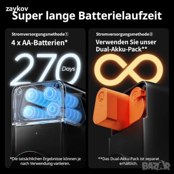 Супер дълъг живот на батерията: С 4 x AA 1,5 V батерии (включени в кутията) можете да постигнете живот на батерията до 6-9 месеца (в зависимост от употребата).