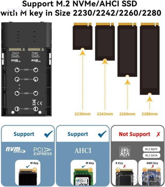 NVMe и M.2 AHCI SSD в размер 2230/2242/2260/2280 (НЕ ПОДДЪРЖА M.2 SATA SSD). Моля, обърнете внимание, че слотът TARGET поддържа само M.2 NVMe SSD, а слотът SOURCE поддържа както M.2 NVMe, така и AHCI SSD.