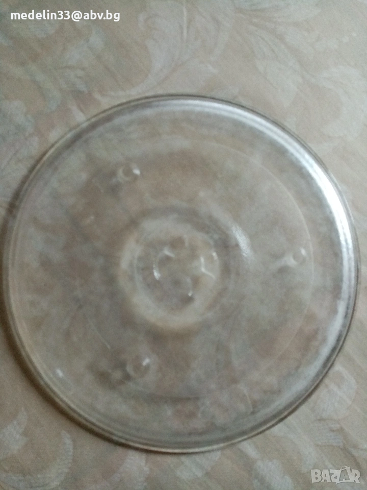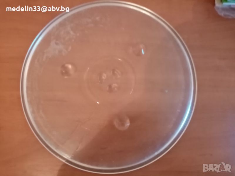 Чинията е здрава с диаметър 32 см и с три броя издатини от долната страна за задвижването. От голяма микровълнова фурна.