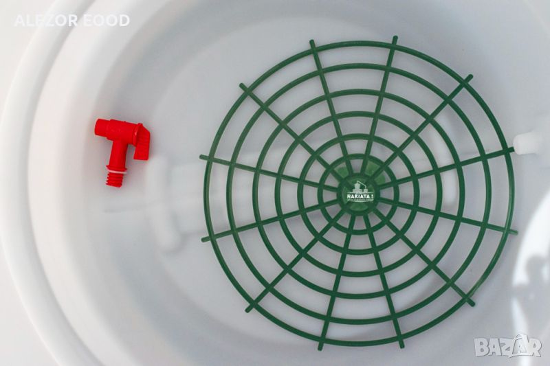 Качествен пластмасови бидон с дебели стени, канелка, притисквач и винтов капак за съхранение на джибри, вода, вино, сок, ракия, туршии, кисело зеле, салати и много други храни или течности за дълъг период от време. Разполага с удобни дръжки за пренос. Винтовият капак се затваря здраво и плътно. Стените са дебели с допълнителни оребрения за по-висока якост. В долната си част има вдлъбната зона с резба за монтиране на кран.