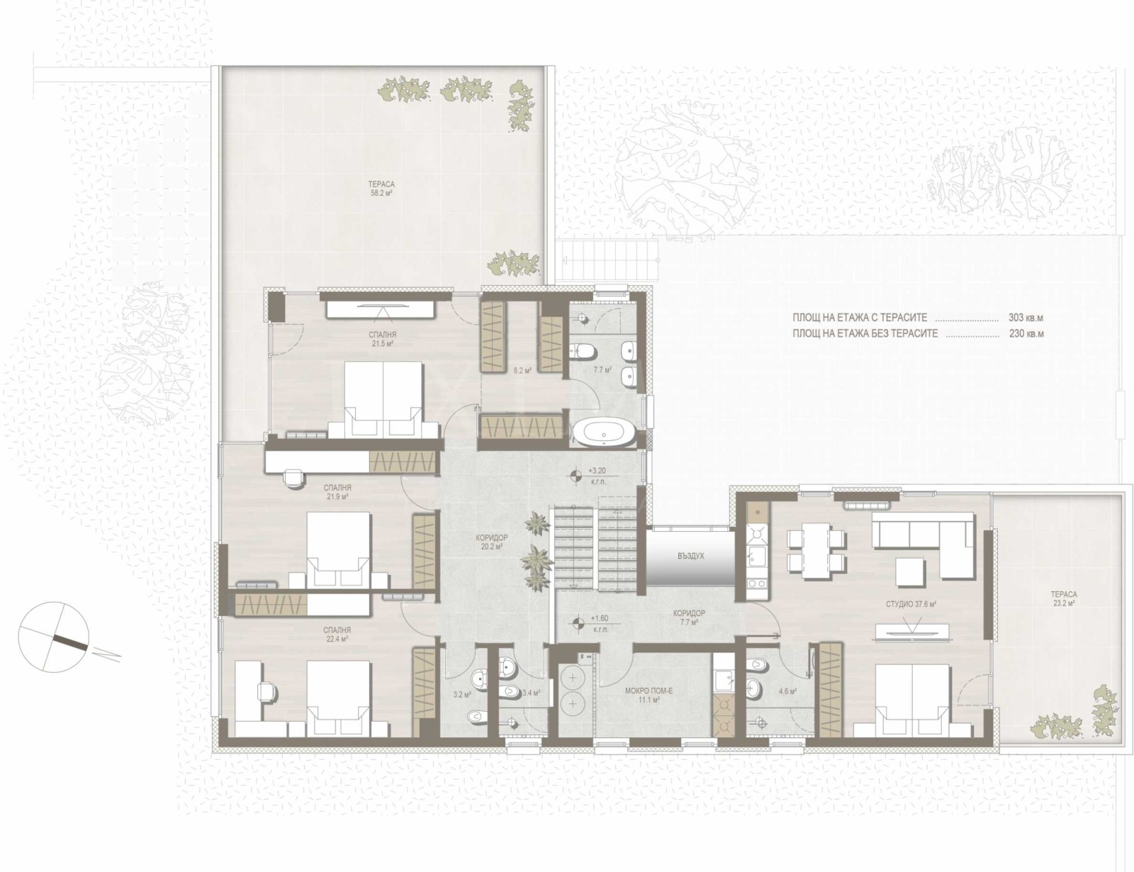 Втори етаж: родителска спалня с дрешник, баня и тераса, две спални, всички с южно изложение, две бани, на полу-ниво: студио с баня и тераса и мокро помещение.