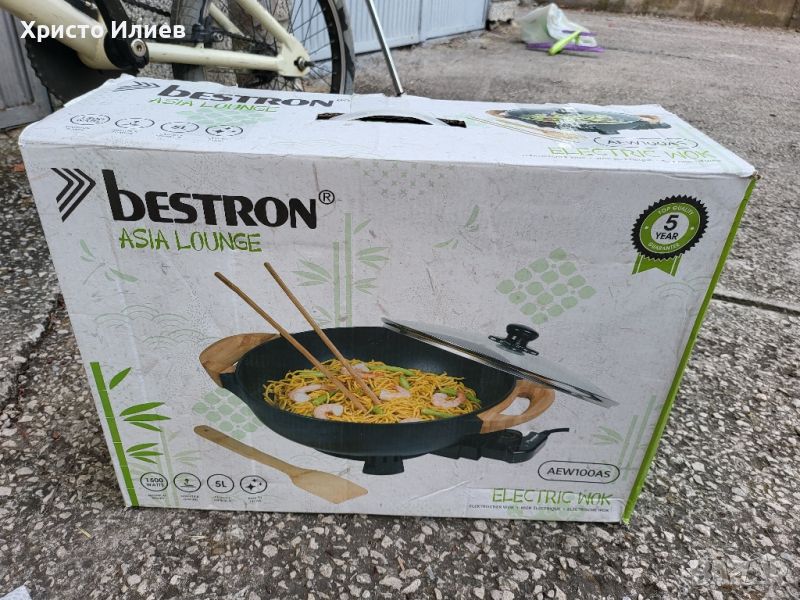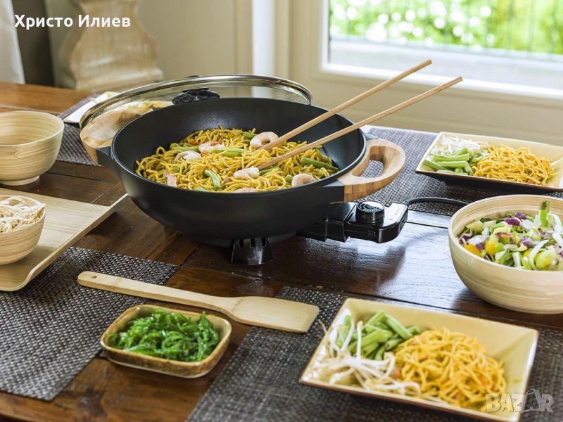 уок тиган (диаметър 32 см, височина 8,5 см) идеален за пържене и задушаване на азиатски зеленчуци, ориз, паста и къри ястия, както и хрупкава риба и месоГолям обем (5 L) за хранене със семейството или приятели, бързо време за нагряване от 2 до 3 минути и постоянна топлина, 5-степенен подвижен термостат със светлинен индикаторЕлектрически тиган с незалепващо покритие за здравословно приготвяне без мазнина, лесно разбъркване с включена бамбукова шпатула, лесно почистване на ръка с препоръчва се влажна кърпаТоплоизолирани бамбукови дръжки и неплъзгащи се крачета, стъклен капак с отвор за изпускане на пара и дръжка, дължина на кабела: 88 смСъдържание на кутията: 1 електрически уок Bestron с бамбукови дръжки, включва: стъклен капак, бамбукова шпатула, 2 XXL бамбукови пръчици за готвене и книга с рецепти, Asia Lounge, обем: 5 литра, размери: 43 x 32 x 19 cm, мощност: 1500 вата, тегло: 3 кг, материал: метал, бамбук, цвят: черен, AEW100AS