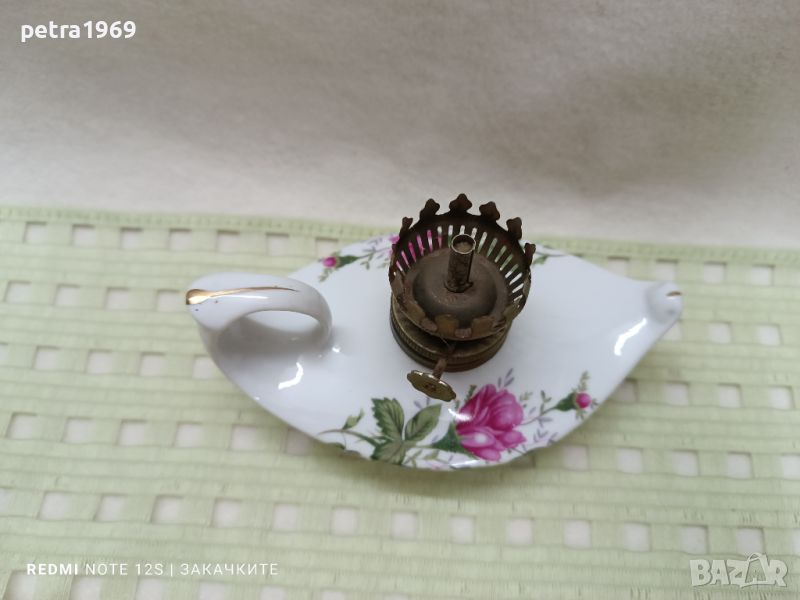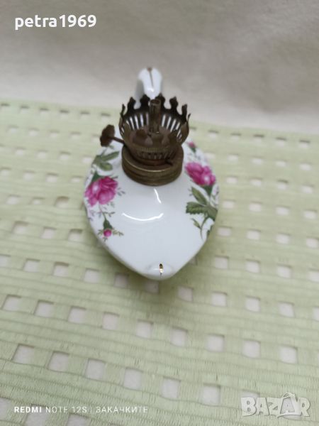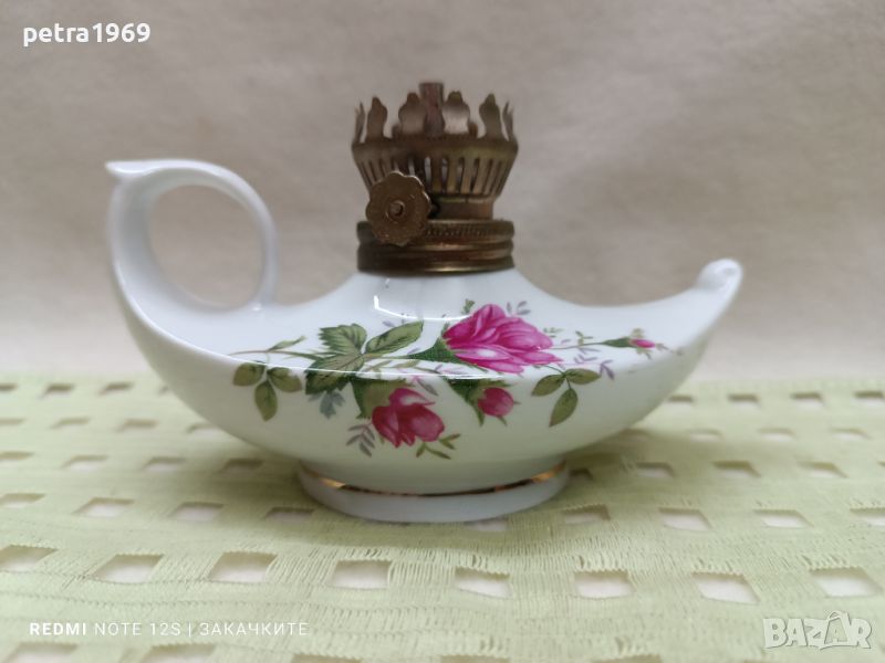 Порцеланова лампа с разкошни рози и розови пъпки, с фитил, без стъкло. Висока е 9 см. с фитила, дълга е 14 см. и е широка 8 см. Напълно здрава, без чукнато, пукнато, наранено, със запазени цветове, рисунък, позлати, гланц, ... Цена 15 лв.