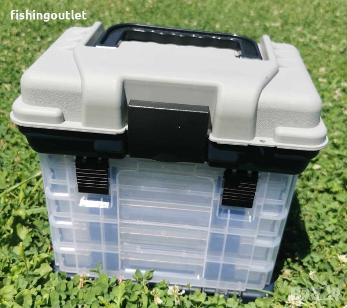 Практичен куфар за риболовни принадлежности, снабден с четири кутии за съхранение, които са разположени в основното отдление зад прозрачен капак с бърз достъп. Моделът разполага с допълнително отделение под горния капак, предлагащо достатъчно място за инструменти и други основни принадлежности. Кутиите са с размери 11 x 23 x 3.30 см, имат по четири надлъжни отделения и са снабдени с по десет броя подвижни разделители.
