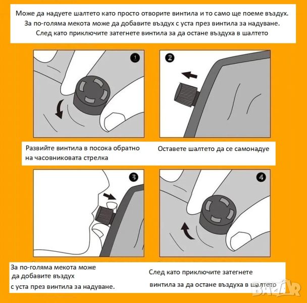 Вентилите се затварят и постелката е готова за ползване. При желание може с уста довкарате въздух за по-голяма мекота.