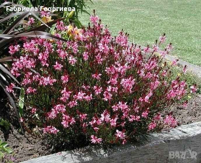 Гаура е многогодишно,студоустойчиво тревисто растение. Има дълготраен и обилен цъфтеж, който започва от началото на лятото до есента. Цветовете са цикламени на дълги и тънки цветоносни дръжки. Листната маса е атрактивна в пурпурно червен цвят. Достига височина до 40/50см. Може да са засажда в алпенеуми, скални кътове, подходящ за оформяне на бордюри както и като единично растение. Изпращаме с ЕКОНТ!!!