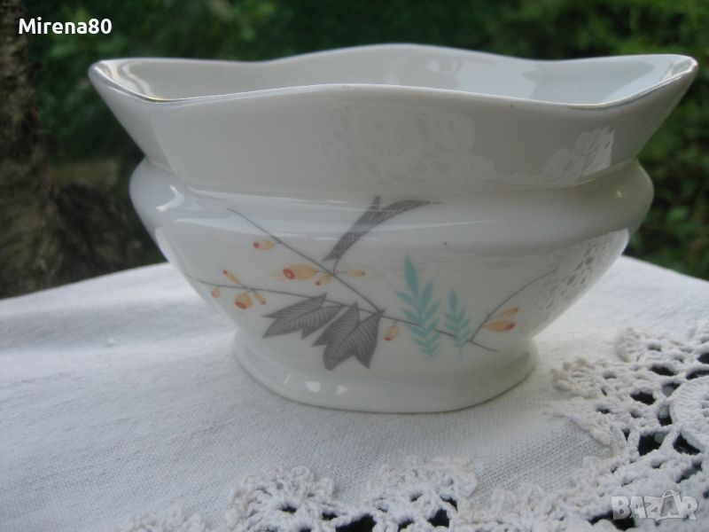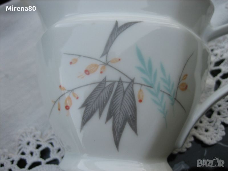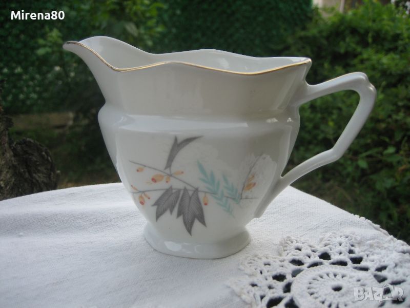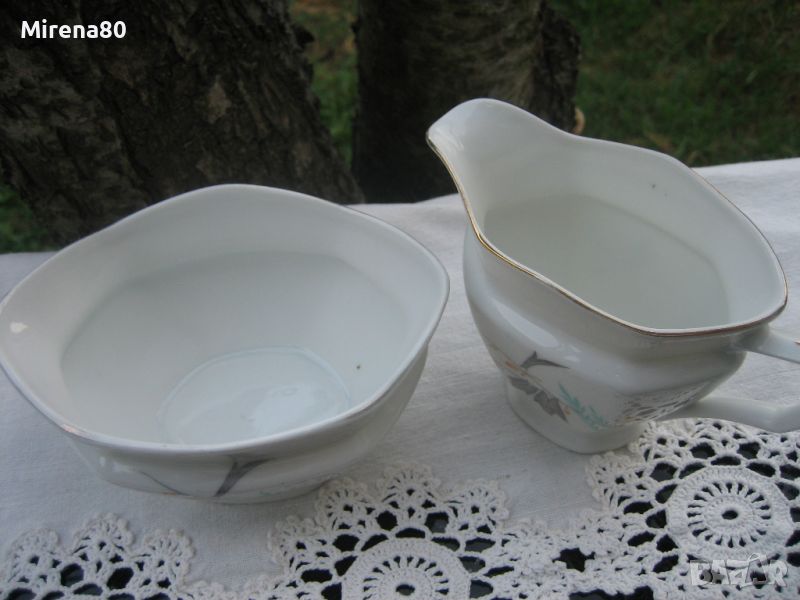 Още едни разкошни порцеланови съдчета (латиера и отворена захарница) на около 100 г. - произведени според маркировката в началото на 20-ти век. Преживели 2 световни войни и запазени в перфектно порцеланово здраве. Декорът е характерен за онези години и за чехословашкия порцелан, а самият порцелан е лек, фин и прозирен. Кантът на захарничката почти липсва, което не отнема от красотата и.