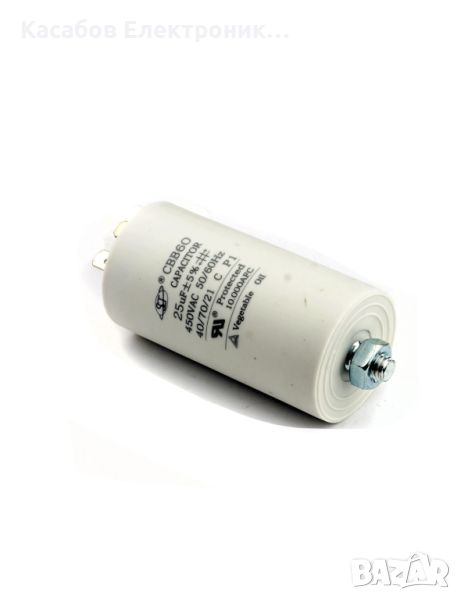 Цилиндричен стартов кондензатор с капацитет 24uF, предназначен за работа с променливо напрежение до 450V AC. Има резба с гайка в долната част за лесен монтаж и 4 контактни пластини, които позволяват удобно свързване във всяка конфигурация. Кондензаторът е напълно запечатан с епоксидна смола, характеризира се с високо качество на изработка, което се изразява в ниски загуби, стабилна работа, висока ефективност и устойчивост на ударен ток.