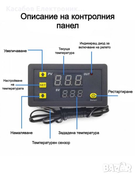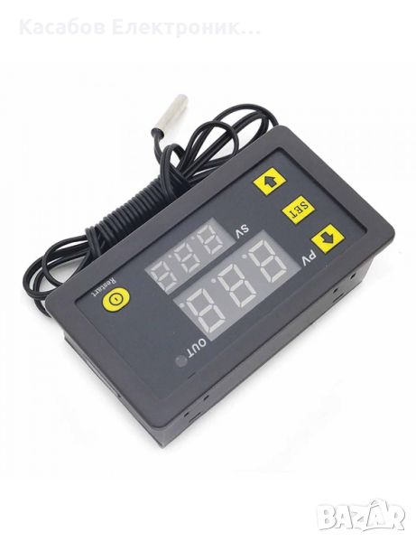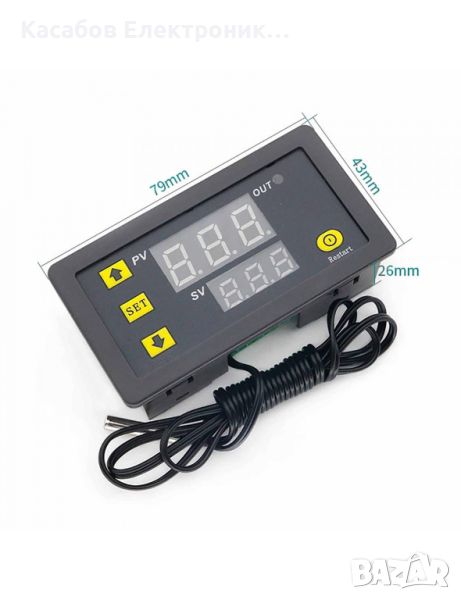 Цифров терморегулатор W3230 в корпус, захранван от 12V, което позволява да се захранва и от батерии. Разполага с два ясни дисплеи, които показват зададената и текущата температура. Високата прецизност на индикацията ни позволява да задаваме и отчитаме температурата с точност до 0.1°C. В комплекта има датчик за температура с 1 метър кабел. Контролерът е лесен за свързване и конфигуриране, има един релеен конектор за включване на свързаното отопление или охлаждане. Има възможност за отложено включване след достигане на зададената температура, което може да бъде полезно за охлаждащи компресори, които трябва да почиват няколко минути след последното включване. Контролерът също ни позволява да зададем хистерезис и да коригираме показаната температура. Хистерезисът ще предотврати непрекъснатото включване и изключване на устройството, когато температурата е балансирана на зададената граница. Благодарение на вградената памет, няма да загубим настройките, дори ако регулаторът се изключи от захранването. Вграденият светодиод сигнализира за работата на релето.