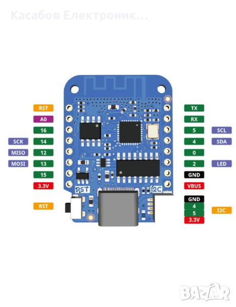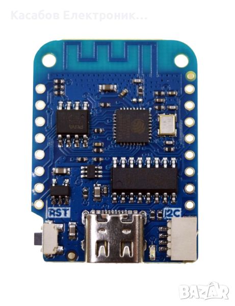 WEMOS D1 Mini версия V.4.0 с USB-C конектор и I2C конектор. Това е ефективен микроконтролер, базиран на системата ESP8266EX, позволява безжична WiFi връзка и има USB порт - през който може да се захранва и програмира. Конверторната система CH340 отговаря за USB свързаността. Разполагаме с 11 цифрови и един аналогов пин, както и 4MB FLASH памет.