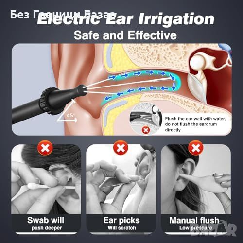 Безопасно и ефективно почистване на ушите: Топла водна струя премахва ушна кал, мръсотия и остатъци без да уврежда кожата.