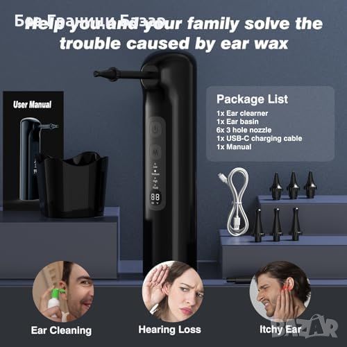 Пълен комплект: 2000mAh презареждаща се батерия, работеща до 3 часа, включва ушен чистач, воден басейн, 6 сменяеми накрайника, USB-C кабел и ръководство.