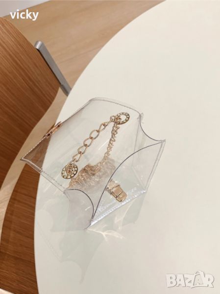 Перфентният аксесоар, за да завършите лятната си визия в горещите дни - на плаж, на разходка, в бар... Изключително удобна малка чантичка, предназначена за телефон и още нещо. Обсипана с много нежни и блестящи брокатени частици. Разполага с дълга дръжка тип синджир в златисто и златиста закопчалка. Материалът е напълно прозрачен - PVC - изключително лесено за поддръжка! Размер: 18х11х4см.