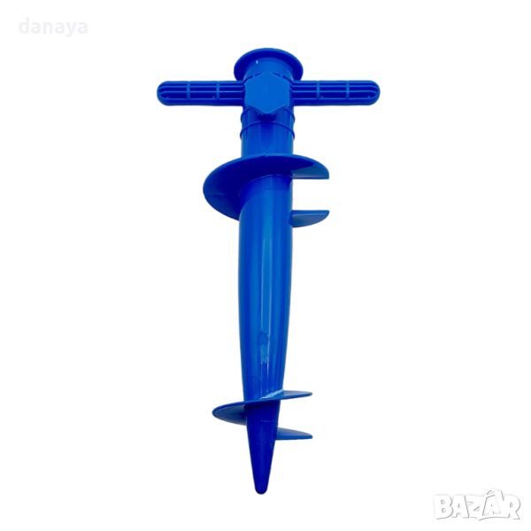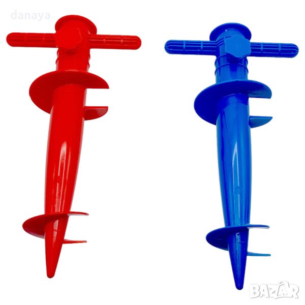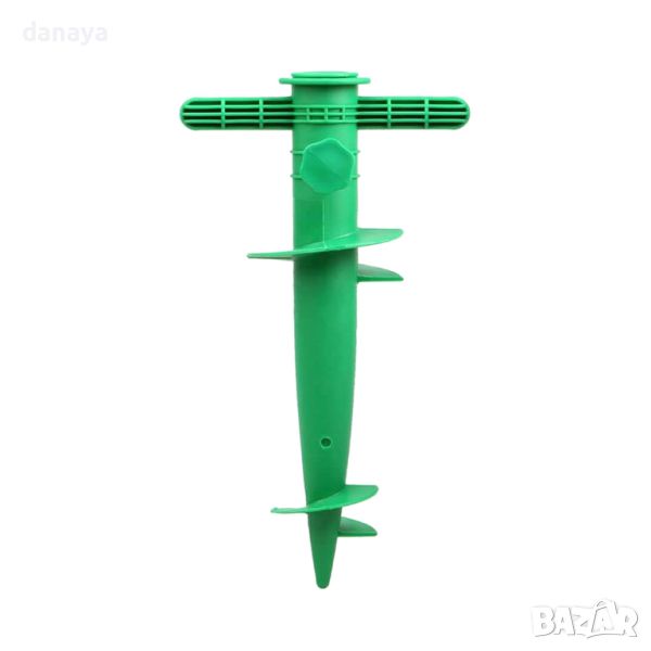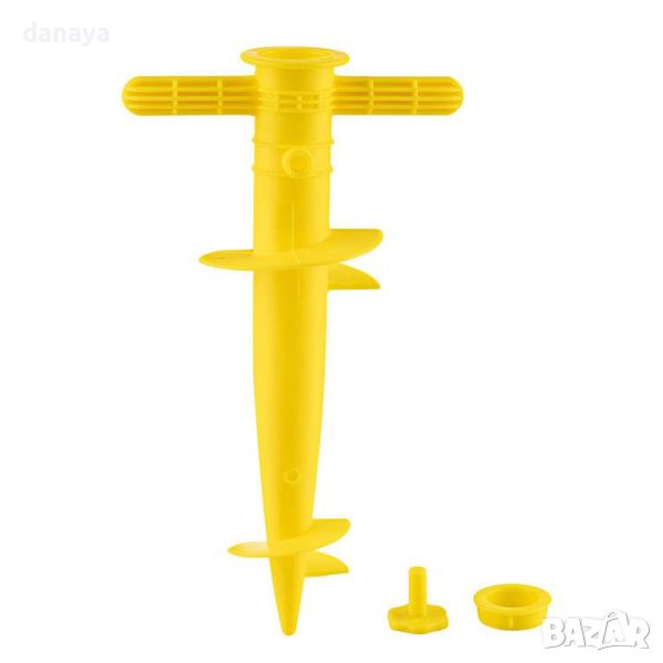 стойка за чадър. Завинтваща се стойка за плажен чадър с удобни дръжки за завъртане. Поставка за чадър с пластмасов болт за затягане. Елементарен, но гениален инструмент, с който лесно и стабилно ще закрепите плажния чадър в пясъка. Чадъра се вкарва в свредлото като се закрепя със затягащ винт. Подходящ за всички модели чадъри. Допълнителна приставка за чадъри с по-тънки тръби. Предлагат се в различни цветове – жълт, зелен, син, червен.
