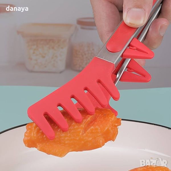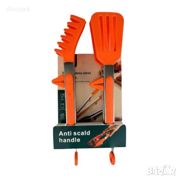 Комплект от 2 броя кухненски щипки за сервиране и готвене с метална дръжка, подсилена със силикон, за да не се хлъзга в ръката и пластмасови щипки. Компактен размер, който е идеален за поставяне на масата за сервиране на салати, спагети и други ястия. С механизъм за заключване и дупка за закачане, когато не се използват. Предлага се в оранжев цвят.