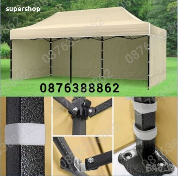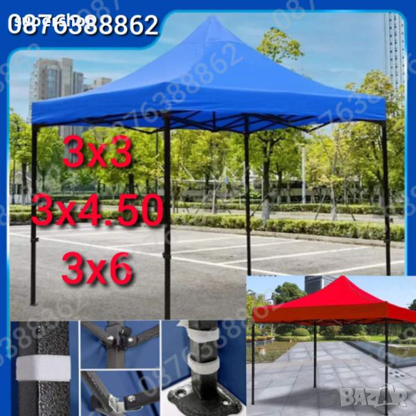 Сгъваеми шатра и тип хармоника 3х3м., подсилена консрукция - 18 кг. подходяща за къмпинг, риболов, събития на открито като представления, сватби, рожден ден, панаири и изложения. Може дори да я поставите в задния си двор, в градината за сянка и отмора за вашето семейство и гости. Вместо да се криете и притеснявате, че ако излезете в най-голямото слънце има вероятност да Ви стане зле и не смеете да излезете навън, ще може спокойно да се насладите на летния прохладен вятър на двора, криейки се на сянка под шатрата. Незаменима при горещо, слънчево време на места без сянка и при дъжд. Направена е с метална и стабилна, неръждаема конструкция и непромокаемо промазано платнище (издръжливо на всякакви климатични условия), а размерите и са съвсем достатъчни, за да си сложите под нея градинска мебел, хамак или шалте за пикник. Бързо сглобяване и разглобяване, лесна за пренасяне, за всички любители на риболова и къмпингуването. Може да бъде разпъната от един човек, без да се налага да търсите някой да ви помага. Всичко това я прави много търсена и предпочитана от всички фенове на риболова.Готова конструкция, хващате и разпъвате за секунди!!Нови шатри тип хармоника, сгъваеми, разпъващи, павилион, шатра сгъваема градинска тента-сенник.Покривало - гумиран полиестер, издръжлив на всякакви климатични условия, непромокаемо, промазано.Размери: 2х2 метра, 3х3 метра, 3х4.5 метра, 3х6 метраВисочина: 2.5 метра;Сгъваем механизъмМетална конструкция шагренНепромокаемо промазано платнище (издръжливо на всякакви климатични условия);Бързо и лесно разпъване;Цени за сгъваеми шатри тип хармоникаМодел 2х2м - шатра черна конструкция шагрен, усилена 129.00лв.Модел 3x3м - шатра бяла конструкция, цена - 120лв.Модел 3х3м - шатра черна конструкция шагрен, усилена - 139.00лв.Модел 3х4.50м - шатра черна конструкция шагрен, усилена - 189.00лв.Модел 3х6м - шатра черна конструкция шагрен, усилена - 270.00лв.Цветове- син, червен, зелен, бял, кремавХарактеристика:- размери: д/ш/в 3 х 3 х 2,50 м.- размери: д/ш/в 3 х 4,50 х 2,50м- размери: д/ш/в 3 х 6 х 2,50мПредлагаме също страници - завеси за шатритеСтраница 3м. - 18лв.Страница 9м. - 40 лв.Страница 12м. - 60 лв.Платнища с размерПокривало за шатр3 х 3м - 50лв.