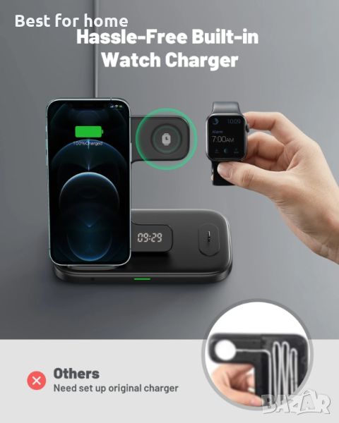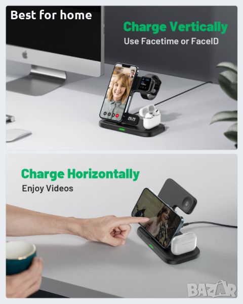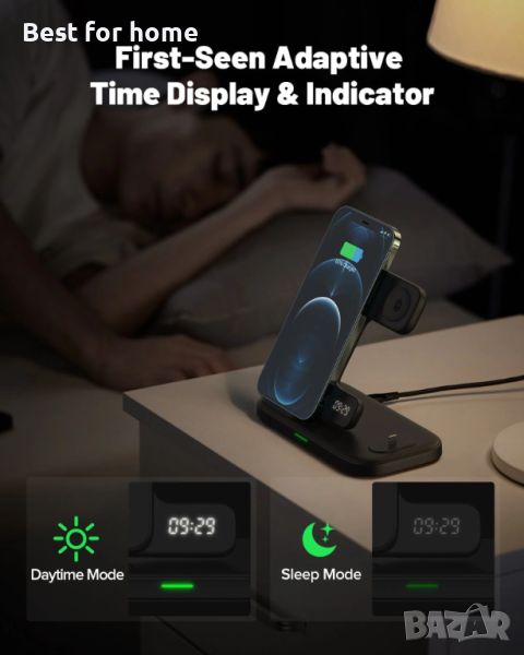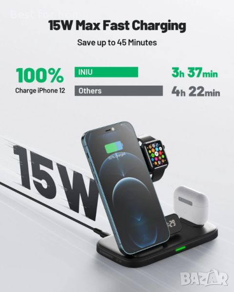 Просто поставете вашите 3 любими устройства и максималното бързо зареждане от 15 W ще съкрати невероятно поне 45 минути време за зареждане на телефона. Първият показван адаптивен дисплей за време и индикатор ви позволяват да проверявате времето и състоянието на зареждане, без да вдигате телефона си. И те автоматично ще регулират светлината си въз основа на условията на околната среда, без досадна светлина, докато вашата красота спи. Елиминирайки обикновения микро вход, INIU AirFuel 3 в 1 приема най-новия PD 3.0 USB C вход за най-стабилното и ефективно бързо зареждане. В кутията: INIU AirFuel 3 в 1 безжично зарядно устройство*1, 25W mini USB-C захранващ адаптер*1, USB C кабел*1 и ръководство за потребителя*1. Съвместими модели за 【iWatch】Apple Watch 8 / Ultra 7 / SE / 6/5/4/3/2; 【AirPods】AirPods Pro 2 / pro / 3-то поколение 2021 / AirPods Pro /2/1; 【iPhone】Apple iPhone 14, iPhone14 plus, iPhone14 pro, iPhone 14 pro max, iPhone 13, iPhone 13 Pro, iPhone 13 Pro Max, iPhone 12, iPhone 12 Pro, iPhone 12 Pro Max, IPhone 14/14 Pro/14 Pro Max/13/13 Pro/13 Pro Max/12/12 Pro/12 Pro Max/iPhone 11, iPhone 11 Pro, iPhone 11 Pro Max, iPhone SE 2 поколение, iPhone X, iPhone XS, iPhone XS Max, iPhone XR, iPhone 8, iPhone 8 Plus; 【SAMSUNG】Samsung galaxy S22 Ultra / S22 / S22+ / S21 Ultra /S21+ / S21 / S20 Ultra / S20+ / Z Flip / S10 / S10+ / Note20 / Ultra / Note10 / Note10+ / Note9 / S9 / S9+ / Note 8 / S8 / S8+ / S7 Edge / S7 / Note5 / S6 и други телефони с активирано безжично зареждане