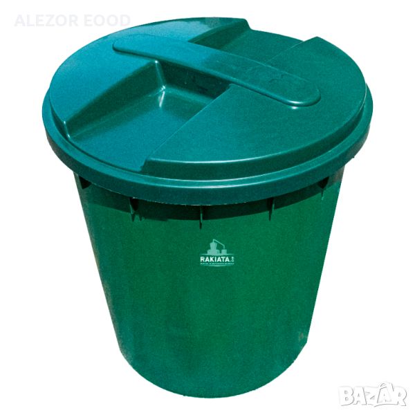 Пластмасов съд с капак, дебели стени и дъно изработено от полиетилен с висока плътност.