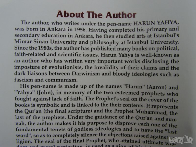 пътуване до Австрия. Книгата е на английски, но е лека , добре написана. Роден в Анкара през 1956 г., Аднан Октар пише книгите си под псевдонима Харун Яха. За разлика от широко разпространената литература тук и в християнския свят, това произведение е в защита и подкрепа на хората проповядващи исляма. Аднан Октар е лидер на ислямски култ и телевизионен водещ. Освен телевизионния канал