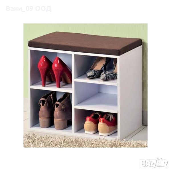 шкаф за обувки с възглавничка за седене с размери Ш:51.5/Д:29.5/В:48 см. Моделът разполага с пет ниши за съхранението на около 5 чифта обувки. Много практично горният плот на шкафа е снабден с възглавничка, където удобно може да седите докато слагате обувките си. Подходящо обзавеждане за повечето входни помещения.
