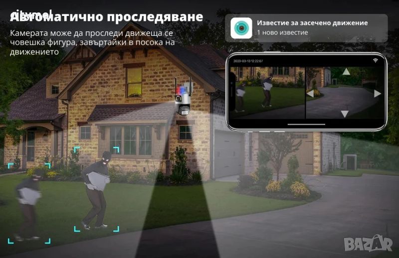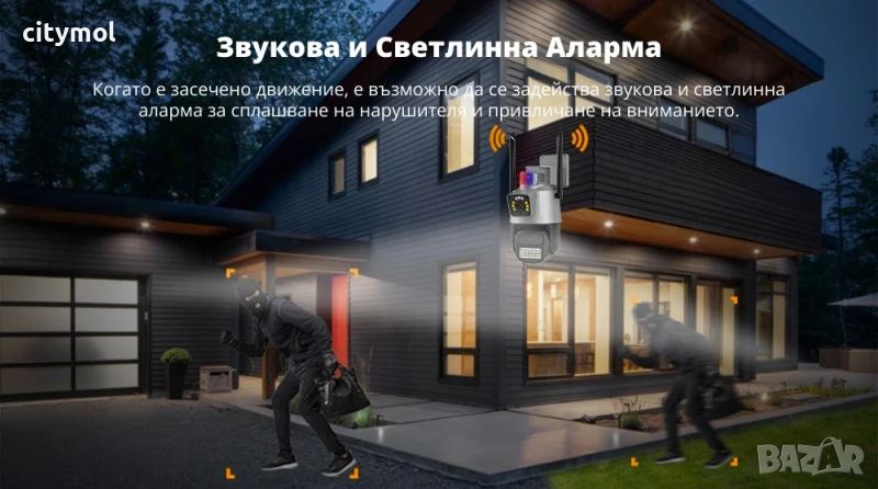 Нов модел иновативна двойна външна WiFi камера с Ultra HD резолюция. Две камери в един корпус: Стационарна и ротационна (въртяща се). 8 Mpx резолюция и за двата обектива. Auto tracking функция за хоризонтално проследяване на движение от ротационната камера. Вграден високочувствителен цифров микрофон за аудио мониторинг и говорител за двупосочна аудио връзка. High Power LED осветители за цветно нощно виждане до 30 метра. Функция за хоризонтално и веетикално проследяване на движението на ротационната камера. Слод за micro SD карта до 128GB. Безплатно мобилно приложение за iPhone и Android - ICSee, XMeye, XMEye Pro за отдалечено наблюдение в реално време и преглед на записите. Завъртане от мобилен телефон по хоризонтала на 355° и по вертикала на 90°. Широкоъгълни обетиви с фокусно разстояние 3.6мм и 6 мм с хоризонтален ъгъл на сцената 90° на стационарната и 120° на въртящата се камера. Функционална стойка даваща възможност за лесен монтаж на таван или стена. Камерата разполага с три нощни режима на работа: Цветен нощен режим, черно-бял нощен режим и цветен нощен режим при движение.