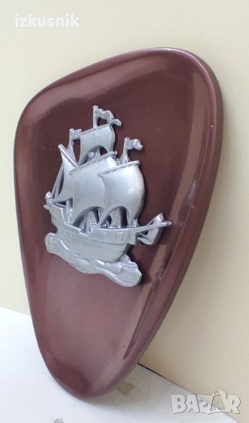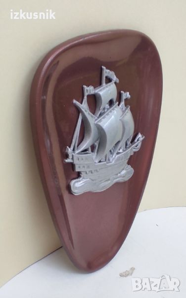 Ефектна метална пластика от Германия. Релеф. Масивна от две части - сребрист платноход върху плакет с меден цвят. Красиво съчетание. Пластиката е за стена, на гърба