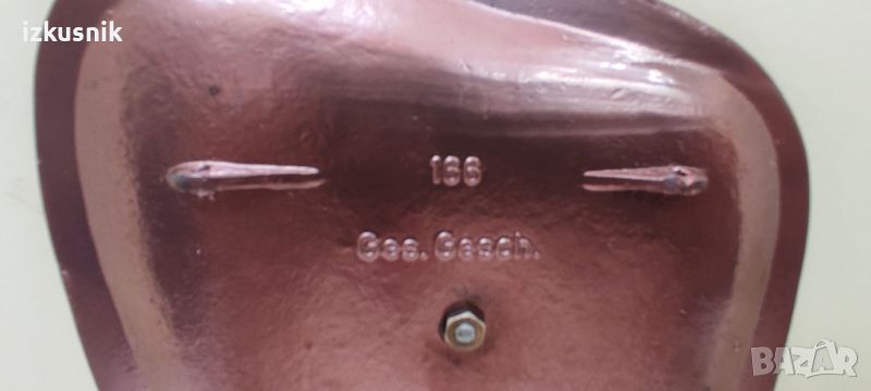 има отвори за шнур с който да се закачи.Изработката е с номер 166 и изписано: Gеs. Gesch., което е съкращение от gesetzlich geschutt, фраза, превеждана като „законно защитен“ или „защитен с авторски права“. Автор обаче не е изписан.Размери: Височина – 155 мм., широчина в широката част -115 мм., в тясната долна част – 55 м.