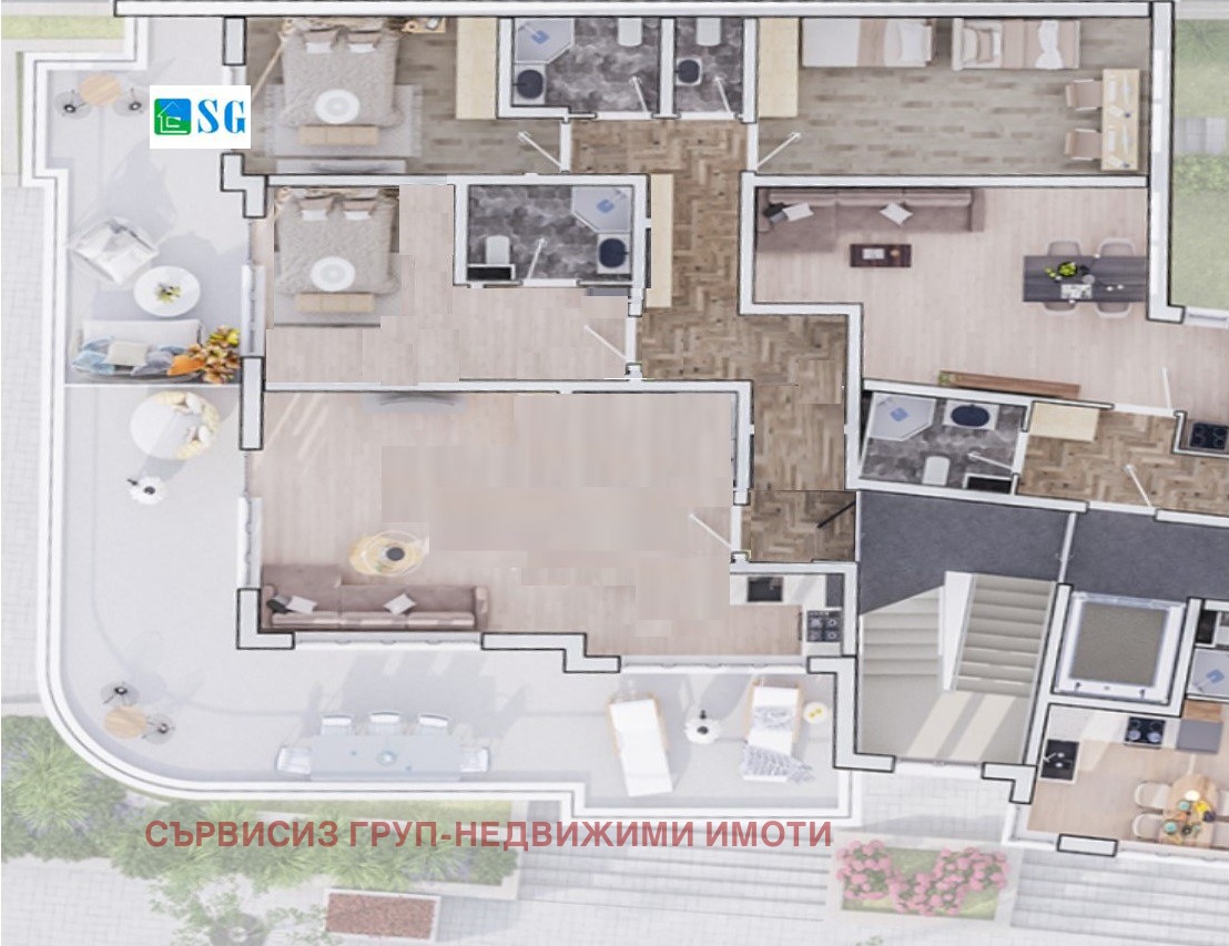 Тристаен апартамент на трети жилищен етаж, с източно изложение. Състои се от входно антре, голяма дневна с кухненски бокс /31кв.м/ и тераса, две непреходни големи спални - 20кв.м и 13кв.м, голяма баня с тоалетна /4,30кв.м/, отделно втора тоалетна /2,60кв.м/.