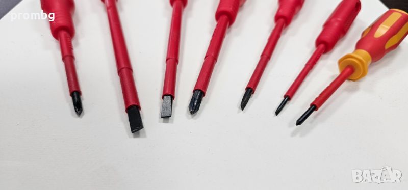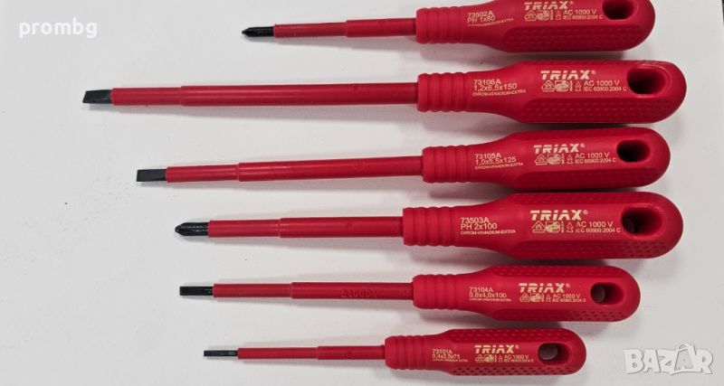 фазомер VDE 1000 V, 8 ч. TRIAX-Германия. В отлично състояние. ( 2 от отвертките са еднократно ползвани, останалите са нови). Материал: хром ванадиева стомана. Комплектът включва: