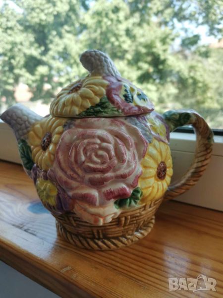 Прекрасен колекционерски чайник. С ръчно рисуваните различни цветя в различни цветове и размери, той със сигурност ще се отличава. Височината с капака е около 17 см, дължина от чучура до дръжката около 17 см. Отлично състояние, без забележки.