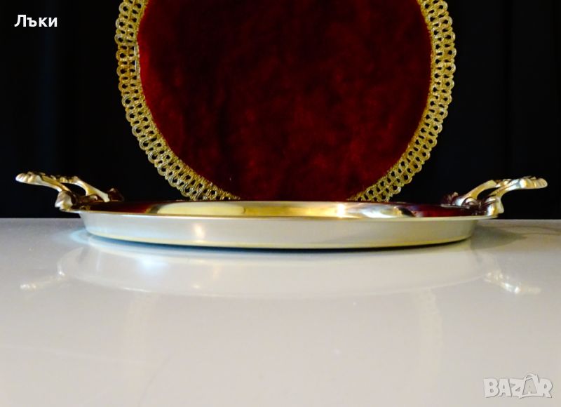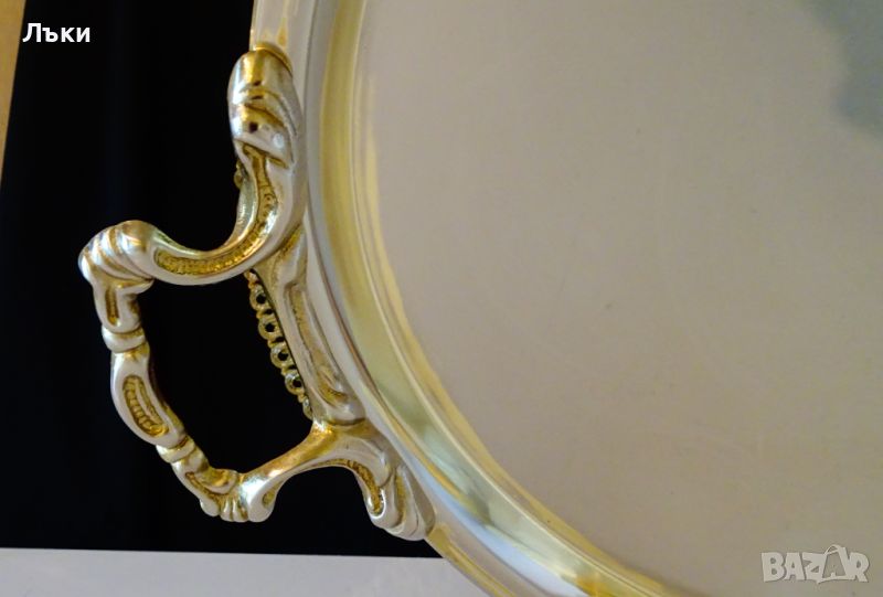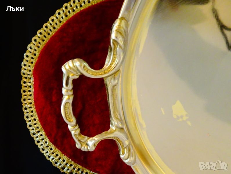 дръжки,релефно отляти от бронз.Подноса е посребрен с висока проба сребро.Вечен поднос.Височина с