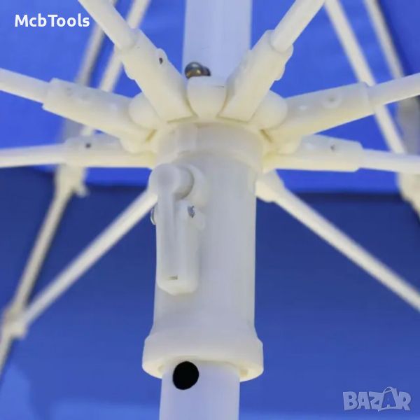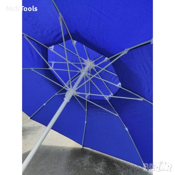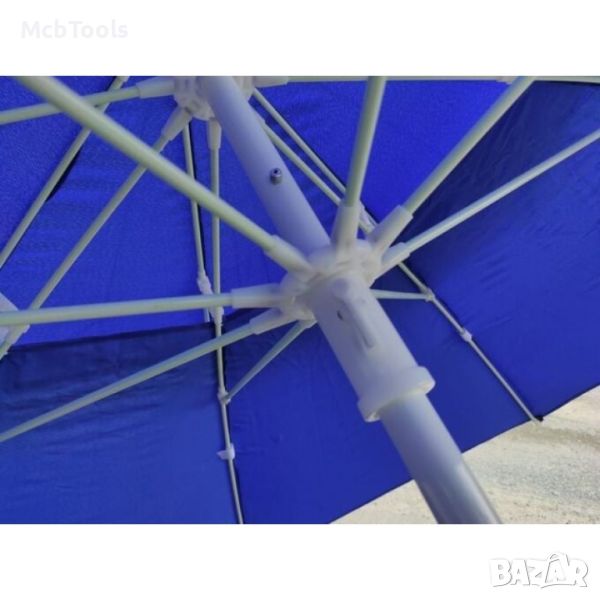 Чадърът е изключително подходящ за използване на плажа, в градината, тераса или къмпинг. Предлага се в 2 цвята – зелен и син.