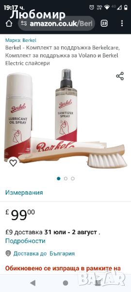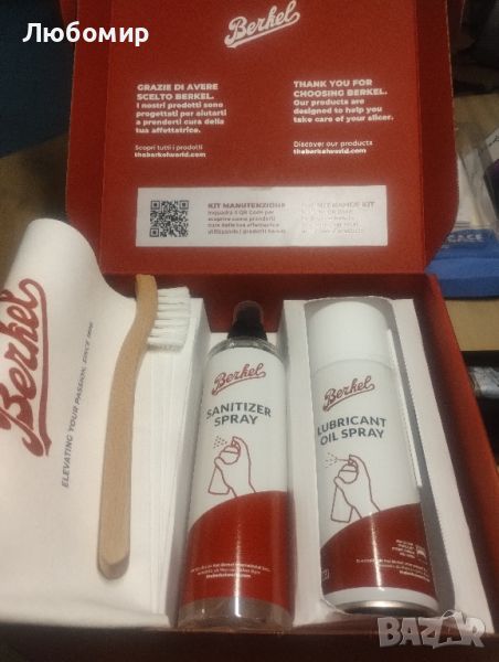 Berkel - Комплект за поддръжка Berkelcare, Комплект за поддръжка за Volano и Berkel Electric слайсери.Комплект за грижа за вашия слайсер, допринасящ за дългия живот на инструментите, като ги прави по-лесни за работа и увеличава тяхната производителност и продължителност. Включва: Спрей за смазващо масло 200 мл - Бутилка със спрей за дезинфекция на ръце и повърхности 250 мл - Четка за поддръжка на острие - Средно липотрофна УЛТРАМИКРОВЛАКНА кърпа, устойчива на миене - Екологично устойчива кутия Crush Cherry - Комплектът може да се използва както за Volano, така и за електрически резачки.Комплектът за поддръжка Berkelcare е проектиран за грижата за вашия слайсер, като допринася за дългия живот на инструментите, като ги прави по-управляеми и увеличава производителността и продължителността.Масленият спрей със специална насочена сламка смазва и гарантира перфектна работа на плъзгащите се лостове. Дълготраен лубрикант, подходящ за редовна употреба върху повърхности от неръждаема стомана и метал, без да ги уврежда. Четка за поддръжка на острието за почистване след употреба, която ви позволява да достигнете до най-трудните за почистване части.Crush Story, история за кръговата икономика: от черешови дървета до хартия Crush Cherry. Съдържащите кутии са разработени по устойчив начин за околната среда, кутия според принципите на кръговата икономика.Комплектът за поддръжка на Berkelcare е проектиран да се грижи за вашия слайсер, като допринася за дългия живот на инструментите, като ги прави по-удобни и повишава производителността и издръжливостта. Спрей маслото със специална насочена сламка смазва и осигурява перфектното движение на плъзгащите се пръти. Лубрикант с продължително действие, подходящ за редовна употреба върху повърхности от неръждаема стомана и метал, без да ги уврежда. Четка за поддръжка на острието за почистване след употреба, която ви позволява да достигнете до най-трудните за почистване части. - Средна кърпа: ултра-микрофибърна, липотрофична устойчивост на пране с контрастиращо лого на Berkel - Дезинфектант: Бутилка със спрей за дезинфекция на ръце и повърхности 250 ml - Спрей за смазочно масло 200 ml - Четка за поддръжка на острието Комплектът може да се използва както за махови, така и за електрически резачки! o История на кръговата икономика: от черешови дървета до Crush Cherry paper. Кутиите, съдържащи комплекта за почистване, са разработени по устойчив начин за околната среда, кутия според принципите на кръговата икономика. Основните характеристики: Екологична хартия, създадена от творческата повторна употреба на обработката на череши: костилките. o FSC сертифицирана, произведена с EKOenergy, без ГМО и съдържа 40% рециклирана след потребление o Въглероден отпечатък намален с 20% в сравнение с традиционна хартия, използваща агропромишлени отпадъци и 100% зелена енергия. Всеки комплект има външна защитна кутия в допълнение към кутията Crush