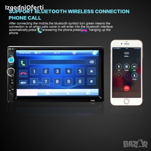 MP 5 устройство на изключително бюджетна цена! Предлага ви всичко необходимо от което се нуждаете, докато сте на път. Разполага с голям 7 инчов TOUCHSCREEN display, гледане на филми и клипове с ВИСОКОКАЧЕСТВЕН ЗВУК И КАРТИНА, вграден микрофон и BLUETOOTH, така че вече имате Handsfree в автомобила си. Когато някой ви търси устройството прекъсва музиката и чувате говорът в говорителите на колата ви. Вие си говорите свободно без да се налага да отделяте ръцете от волана, благодарение на вграденият в устройството микрофон. Вие също може да избирате телефонни номера директно от мултимедията. Освен това устройството може да чете всички видове видео и музикални формати, има вграден радио приемник с автоматично сканиране на ефира и запаметяване на станциите, може да сменяте цвета на подсветката според интериора на автомобилът ви, да зареждате телефонът си през пригоденият за целта USB изход, може да сдвоявате мултимедията с телефона си или да я управлявате от мултифункционалният си волан. Системата има AUX функция, поддържа USB flash памети и TF (SD card) до 128GB, Bluetooth функция, FM функция и всичко това може да управлявате от IR дистанционно управление от разстояние до 10 метра.
