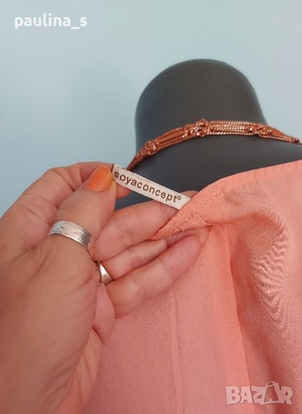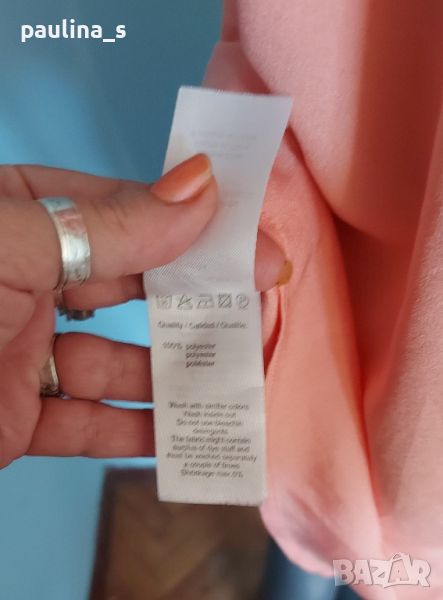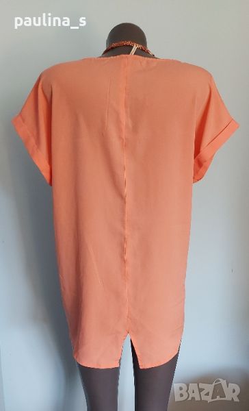 Ефирна туника в екзотичен цвят с издължена задна част. Материята има лека еластичност и покрива няколко размера, посочени са. Моделът се вижда добре. Без дефекти и етикет, една бройка е.