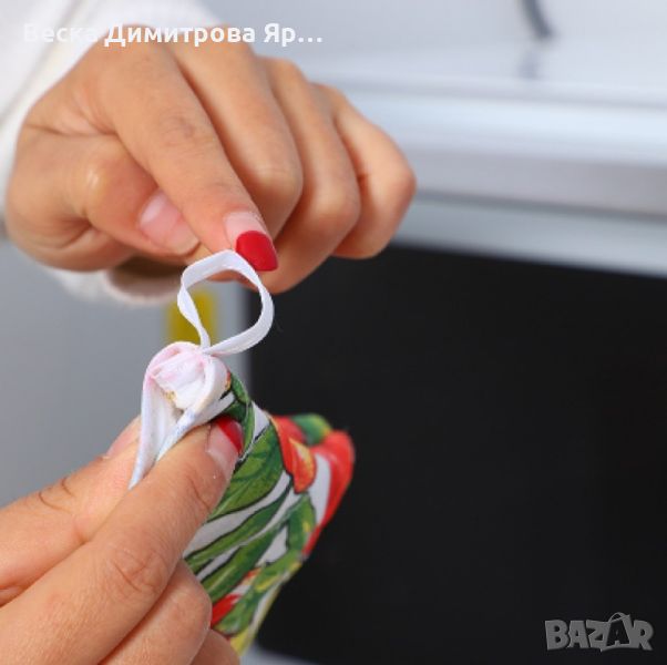Материали: Памук и лен; Размери: 16 x 27 см; Цвят: Многоцветен с мотив плодчета; Изработка: Шев с диамантена форма; Грижа: Пране на ръка с топла вода; Допълнителни характеристики: Връв за окачване, дебел и издръжлив, против изгаряне и топлоизолатор.